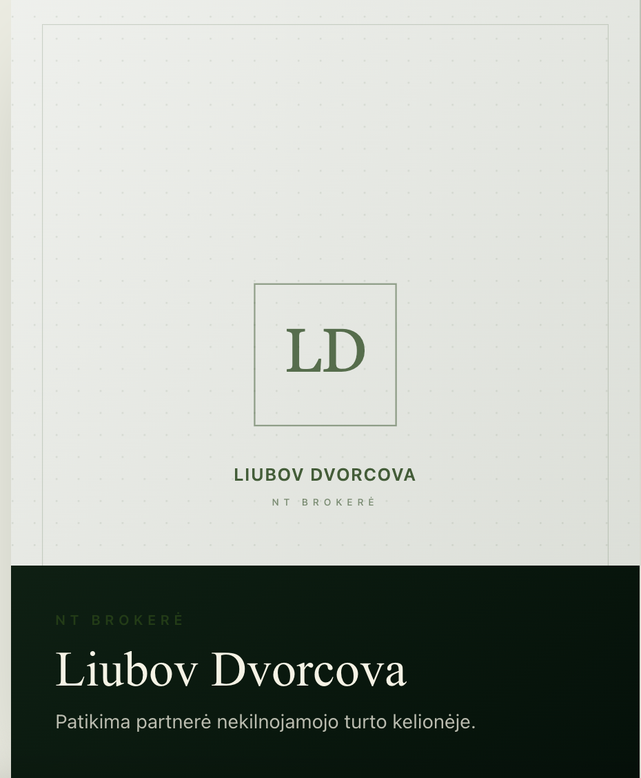 Esu Liubov Dvorcova — nekilnojamojo turto brokerė, dirbanti su klientais visoje Lietuvoje. Mano siekis — paversti NT procesą aiškiu, skaidriu ir tikrai maloniu, kad jis liktų atmintyje šviesia patirtimi.